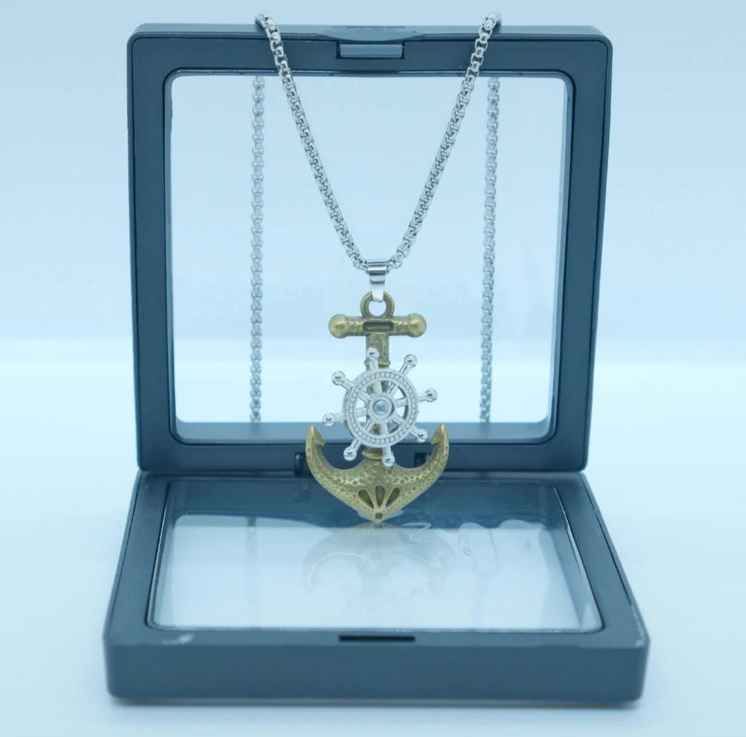 El colgante une dos elementos icónicos del mundo náutico: el timón representa el control y la visión, mientras que el ancla simboliza firmeza y conexión con tus raíces. Juntos, narran una historia de equilibrio entre movimiento y estabilidad.