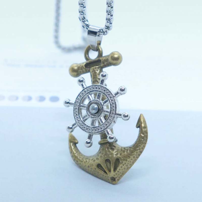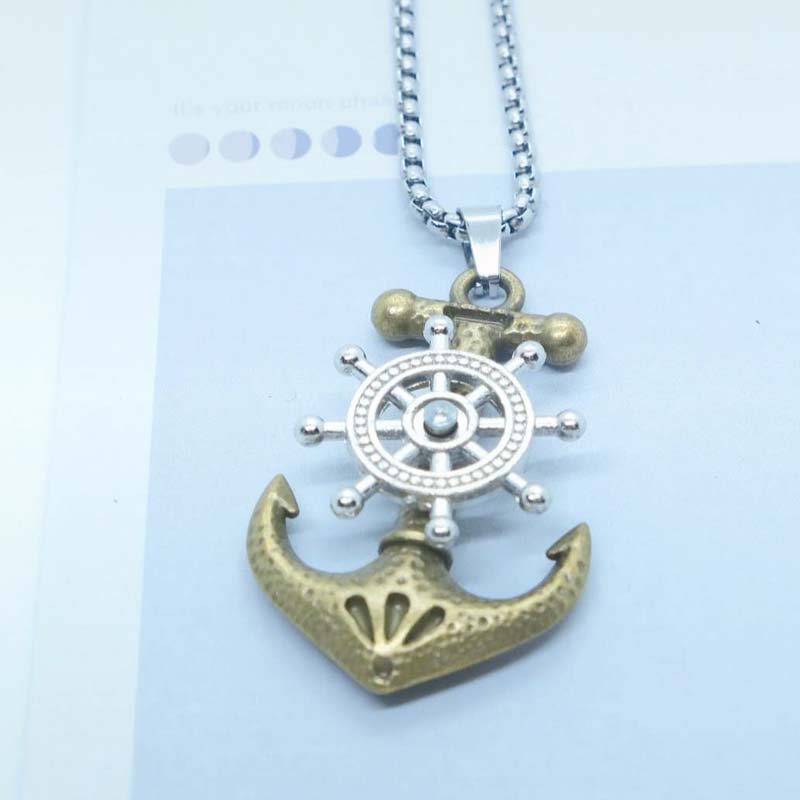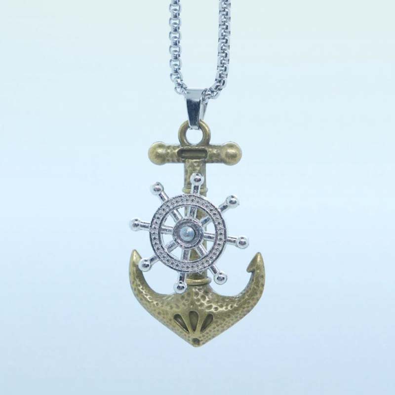 Este collar no es solo un accesorio, es una brújula simbólica para quienes se atreven a marcar su propio rumbo. Un colgante audaz que fusiona el ancla (fuerza, estabilidad) y el timón (dirección, liderazgo), en un diseño de 4 cm, que combina acabados metálicos en bronce y plata para un look distintivo y poderoso.